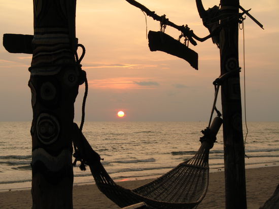 Und zwei Stockwerke tiefer am Strand mit herrlicher Haengematte. Genau richtig zum chillen.