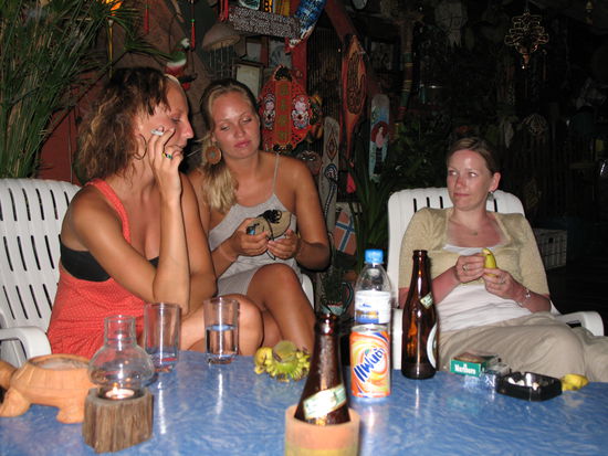 Abends sitzen wir in lockerer Runde vor der gemeinschaftlichen Bar. Little Boo, der juengste Bruder des Inhabers flirtet mit Nadja, einer Schweizerin