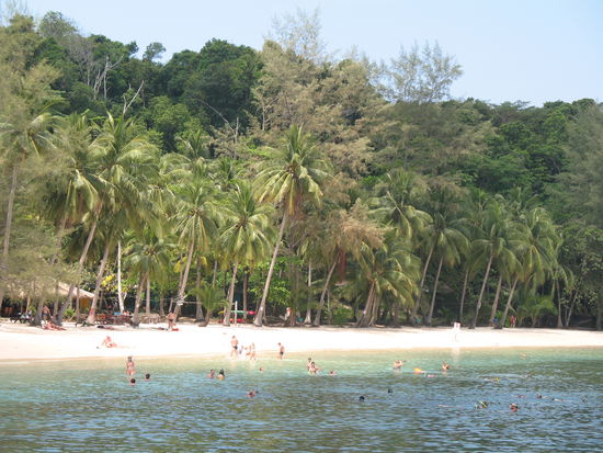 Unser erster Zwischenstopp auf Ko ... (Name vergessen bzw. Karte gerade nicht zur Hand). Sehr schoener Strand. Die relativ vielen Leute, die man sieht, sind meist beim Schnorcheln. Ausser uns hat zuvor noch ein weiteres Boot angelegt.
