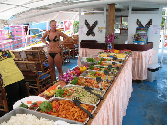 Waehrend wir schnorcheln wird an Bord unser Mittagsbuffet vorbereitet und es bietet sich mir ein sehr leckerer Anblick
