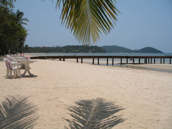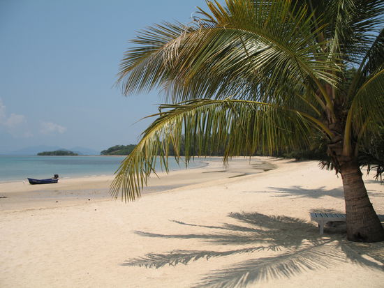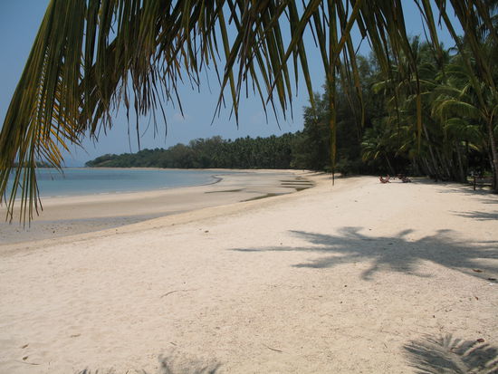 Waehrend wir essen geht die Fahrt weiter Richtung Ko Mak, die ca. 34 km entfernt suedlich von Ko Chang liegt. Mit dem Taxiboot werden wir nach und nach uebergesetzt und ich sehe den seither schoensten Strand, den ich jemals zu Gesicht bekommen habe...