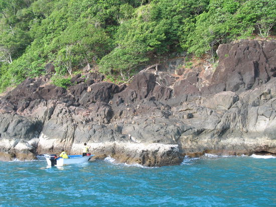 Auf der Rueckfahrt passieren wir noch "Monkey Island", und als 2 von unserer Crew die Reste vom Obstbuffet verfuettern, kommen bestimmt weit ueber 40 Affen aus dem Dschungel, die hier bei dieser Aufloesung nur als kleine Punkte auf dem Felsen sichtbar sind.