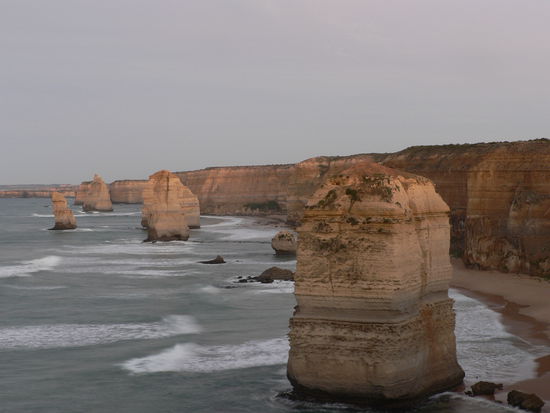 Wir sind um viertel vor 5 Uhr morgens aufgestanden und fahren zum Aussichtspunkt der Twelve Apostel. Es ist tiefe Nacht. Der Himmel ist glasklar. Wir sehen die Milchstrasse ganz deutlicht. Corinna zeigt mir das Kreuz des Suedens. Und waehrend wir da so sitzten, sehe ich mindestens drei Sternschnuppen und zum kroenenden Abschluss der Nacht einen Satelitten. Wahnsinn, er zieht den Himmel entlang, wie ein Flugzeug, blinkt aber nicht, sieht eher aus, wie ein Stern, der sich bewegt. Soll ich euch jetzt sagen, das es erst ab 7 Uhr gedaemmert hat, toll oder, bestens gemacht. Sau kalt war es auch noch. Aber dann. Es war wunderschoen. Der Himmel ist rot. Die Twelve Apostel sind rot. Alles erwacht. Ein Traum. Wir bleiben bis die Sonne um halb 8 Uhr ganz raus gekommen ist. Fazit: Frueh aufstehen lohnt sich immer!