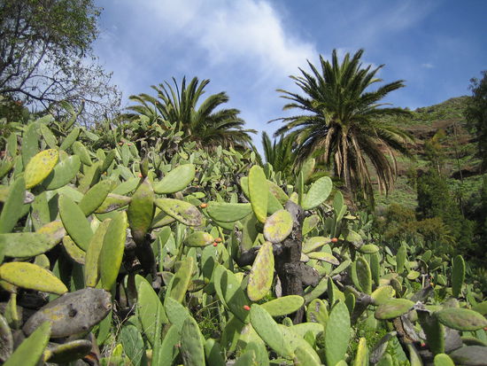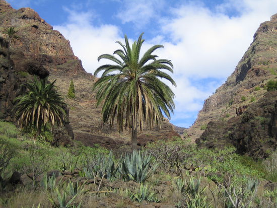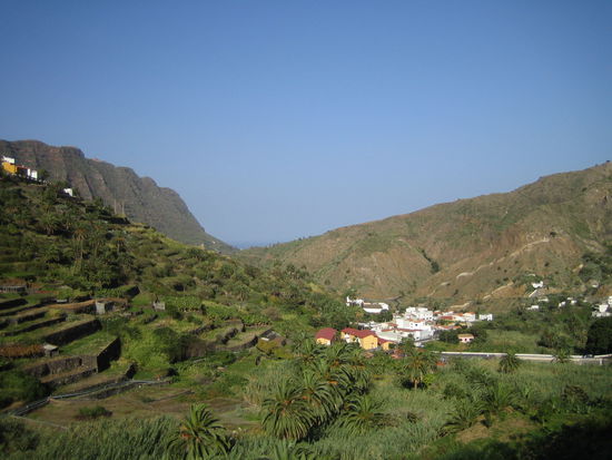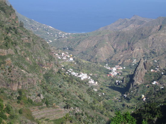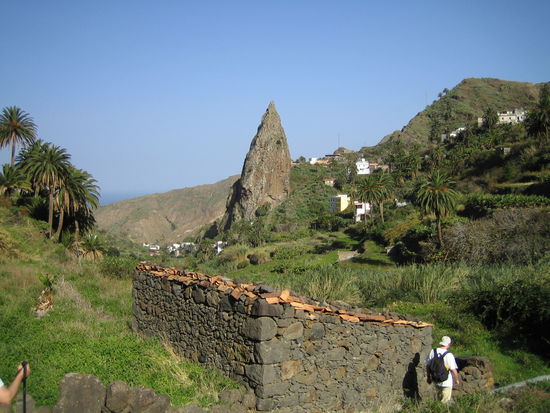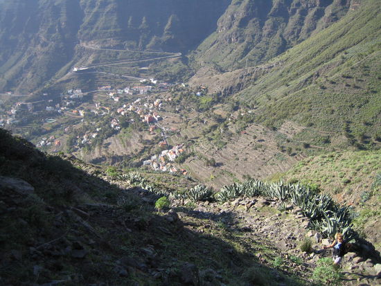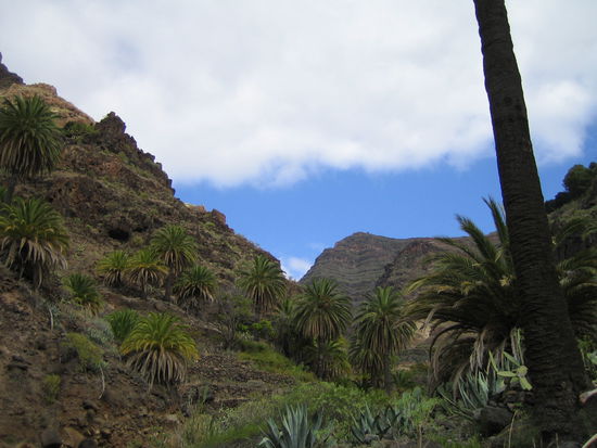 Von unserem Ausgangspunkt - der Höhenstrasse - auf 900 m Höhe wanderten wir durch palmengesäumte Täler, vorbei an Kakteenfeldern, Agaven und verlassenen Gehöften. Abstieg bis zum Fischerort Playa de Santiago, wo Robin und ich im Meer badeten. Das tat richtig gut!