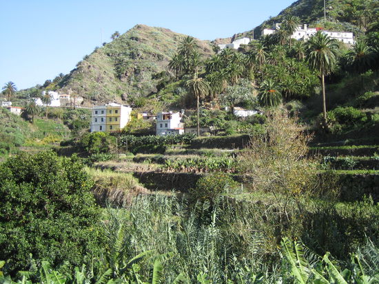 Immer wieder sieht man, wie sich - teilweise verfallene - Natursteinhäuser an den Hang schmiegen, ringsum ragen schlanke Palmen auf. Im Westen, wo auch das Valle Gran Rey zu finden ist, sind Cañonartige Schluchten und viele Steilhänge, viele Terassen und tausende kanarischer Palmen. Im Süden der Insel findet man tief eingeschnittene Schluchten (Barancos), Terassenfelder, die die Hänge bedecken und insgesamt eine oft steinige Landschaft.