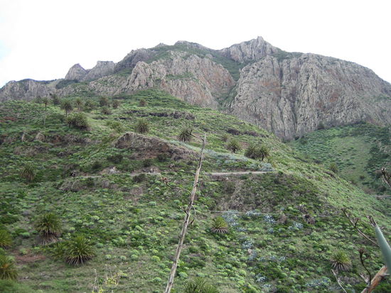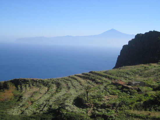Von Agulo aus stiegen wir auf dem Panoramapfad die rote Wand hinauf bis zum Aussichtspunkt. Die zunächst fast unbezwingbar scheinende, vor uns aufragende Steilwand mit einem leicht zugewucherten Weg haben wir wacker genommen. Schließlich standen wir nach bisher 6 Wanderungen nun gut im Training. Trotzdem wackelten uns nach dieser Anstrengung bei Erreichen des Mirador de Agulo leicht die Knie. Fantastische Ausblicke auf den höchsten Berg Spaniens auf Teneriffa, den Teide. Vorbei am Stausee La Palmita über die Hochebene von Palmita bis zum Informationszentrum des Nationalparks Juego de Bolas. Dann folgte der steile und Abstieg auf einem Panoramaweg vorbei am Berg Roque Cano bis nach Vallehermosa. Dort gab's an der Plaza erst mal einen wohlverdienten frisch gepressten Orangensaft.