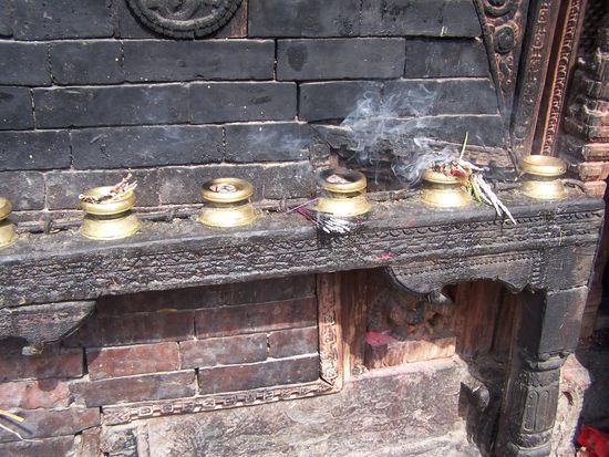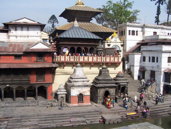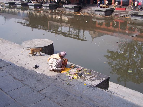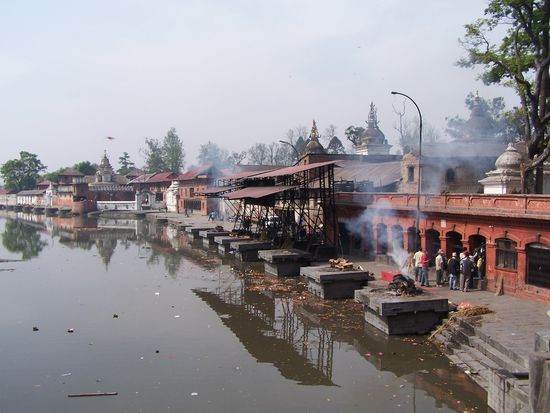 Nun steht meine Kathmandu-Stadtführung auf dem Programm. Einen Guide bräuchte man hierfür wahrlich nicht, das kann man auch prima alleine machen, aber nun habe ich schon einen, dann soll er seinen Job auch tun. Als erstes fahren wir in die heilige Hindu-Tempelanlage und Verbrennungsstätte Pashupatinath, das ist das nepalesische Pendant zu Varanasi. Gelegen am heiligen Fluss Bagmati, ist der eigentliche Tempelbereich für Nicht-Hindus nicht zugänglich. Und ich glaube, das ist auch gut so. Allzu foto-versessene Touristen würden sonst die religiösen Zeremonien sicher sehr stören. Von den gegenüberliegenden Terrassen hat man aber einen sehr schönen Blick auf das Geschehen und bekommt einen guten Eindruck dessen, was sich im Tempel abspielt. Das Fotografieren und Filmen von Verbrennungen ist hier nicht verboten, aber man sollte sich gut überlegen, ob man fotografierende Touristenhorden bei der eigenen Beerdigung oder der eines Familienmitgliedes sehen möchte und sich dann - trotz aller Neugier - entsprechend diskret verhalten.