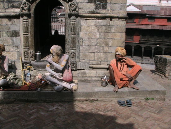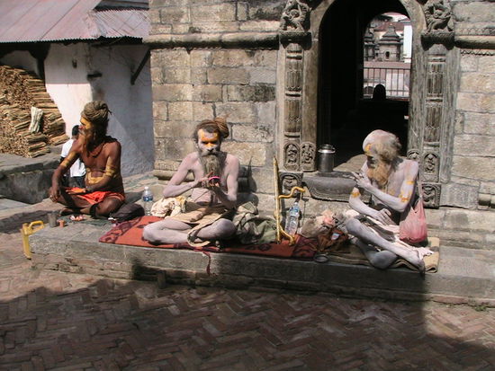 Im Gegenzug warten jetzt Sadhus auf meinen Auftritt als perfekte, fotogeile Touristin. Ich rede mir ein, daß ich durchaus unangebrachte T-Shirts tragen darf, wenn sich heilige Männer nicht zu schade sind, sich für ein paar Rupees für Fotos zur Verfügung zu stellen. Auge um Auge, oder wie heißt es so schön ? An einem T-Shirt ist noch keiner gestorben und an 20 Rupees/pro Mann und Foto auch nicht ! Buddha sei Dank, haben Nepalis eine Riesen-Portion Humor !