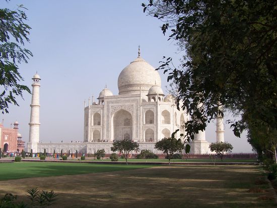 True love ! Taj Mahal wurde von Shah Jahan gebaut als Grabmal für seine geliebte Ehefrau Mumtaz Mahal, die kurz nach der Geburt ihres 14. Kindes starb. Das Taj wurde 1653 vollendet. Es steckt voller Schätze. Der schneeweiße Marmor stammt aus Makrana in Rajasthan - noch heute berühmt für Marmor. Die Ziersteine - darunter Onyxe, Amethyste, Türkise, Lapislazuli, Jade, Kristalle, Korallen und Perlmutt wurden aus ganz Asien herangeschafft. Shah Jahan wurde ebenfalls hier neben seiner Mumtaz bestattet. Die Schmuckgräber in der Grabkammer sind jedoch leer, die echten Gräber liegen darunter.