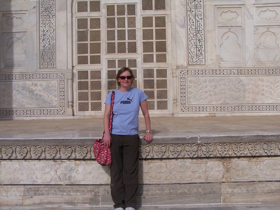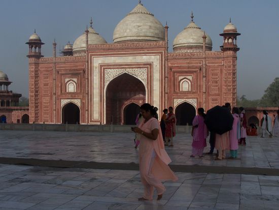 R. steht parat, sieht aber noch ein bißchen nach exzessivem "Männerabend" von gestern aus, unrasiert und zerknittert...ok, seinen Kater möchte ich nicht haben ! Mich stört´s nicht, außerdem wird er meine Besichtigunszeit im Taj für´s Duschen usw. nutzen. Die Fahrt ist kurz, mein Guide für Agra steigt zu, stellt sich als Bob vor und ist ein älterer Herr, der aber sehr agil ist und echt weiß, was er will. Das Taj kennt er wie seine Westentasche, ist ja klar. Man darf nicht mit dem Auto direkt vorfahren und erledigt die letzten paar hundert Meter per Auto- oder sonstiger Rikscha (zu Fuß ist´s auch kein Problem). Die Sicherheitskontrollen am Eingang sind scharf, Zigaretten + Feuerzeug geht nicht, ich muss das deponieren. Gleich ab Eingang ist nur noch Staunen angesagt !