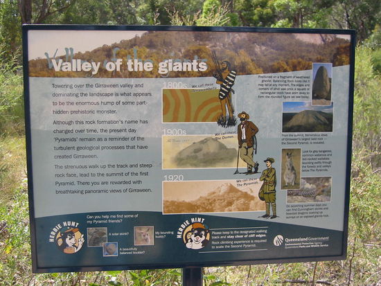 Nach einem Tag Vorbereitungen ging es vergangenen Freitag in den ca. 300km entfernten Girraween Nationalpark. Dieser Park wurde einst von Aborigines bewohnt und der Name bedeutet soviel wie "Ort der Blumen" (welche wir aufgrund der derzeitigen Jahreszeit nicht ganz so bewundern konnten). Er zählt mit zu den schönsten Queenslands und ist wirklich einzigartig. Er ist inmitten von einer aus massiven Granit bestehenden Gebirgslandschaft, mit einmalig geprägten, riesigen "balancierenden" Gesteinsbrocken, die aussehen, als würden sie gleich umkippen. Die Tierwelt lässt auch keine Wünsche offen, man kann nicht nur eine Menge Vogelarten beobachten, sondern auch Echsen, Opossums, Echidnas und Kängurus.