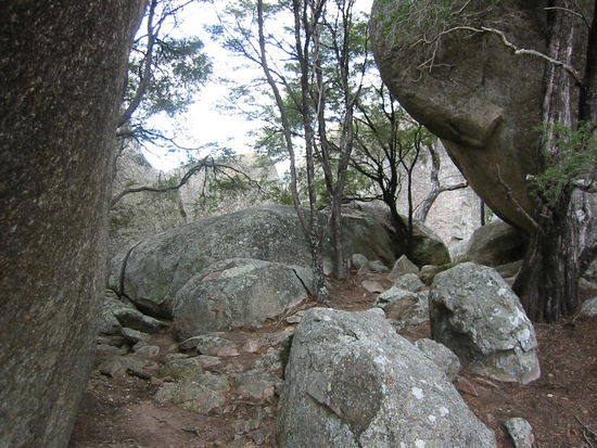 Nach der ersten aufregenden Nacht mit ungewohnten Tierlauten direkt in näherer Umgebung ging es dann am nächsten Tag zu den "Pyramiden", einer 3,5 km langen Tour, die wir noch nicht wirklich einzuschätzen vermochten. Nachdem wir die ersten großen flachen Granitplatten passiert hatten, ging es dann gaaanz viele Stufen aufwärts und wir sahen in einiger Entfernung einen verdammt großen und steilen kahlen Granitberg, an dem eine Menge Leute hochkraxelten. Zu dem Zeitpunkt dachten wir uns noch: "Mensch, da müssen wir morgen unbedingt mal hoch, das ist bestimmt die richtig lange Tour." Ein paar vieeelee Stufen weiter standen wir aber plötzlich vor genau diesem Berg! Die Wand, vor der wir nun standen hatte locker 45 Grad und war echt respekteinflössend. Also Beine in die Hand und ab zum Gipfel. Angekommen wurden wir auch gleich mit einem atemberaubenden 360 Grad Panoramablick über den Park, einem Ausblick auf den "Bald Rock" ( kahler Riesengranitgigant) und ein paar großen balancierenden eiförmigen Gesteinsbrocken belohnt.