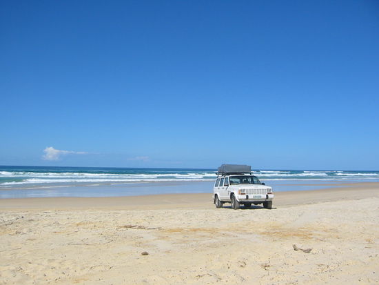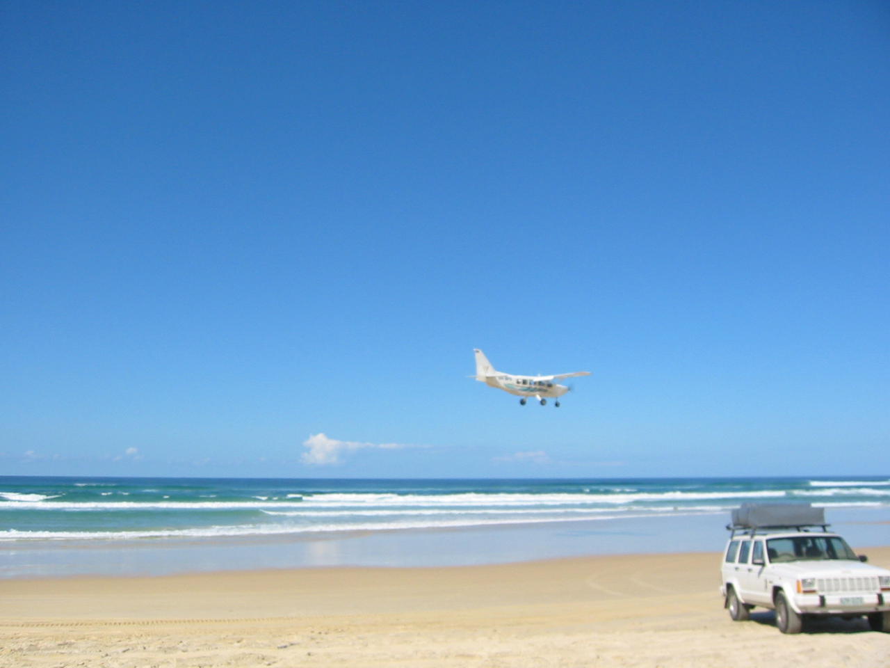 Nach einer erstaunlich ruhigen Nacht mit wenigen Tierlauten sind wir am nächsten Morgen gleich losgezogen um in den Norden der Insel zu fahren. Begonnen haben wir diesen Trip vom kleinen Inseldorf Eurong, von wo aus wir dann auf den Strand gefahren (!) sind. Erst wollten wir an den Strand laufen, bis wir Blitzbirnen realisierten, dass wir den ja befahren dürfen. Und da standen wir nun, mitten auf der Inselautobahn, dem 75-Mile-Highway, der bei Ebbe fast einer Asphaltstraße glich und gleichzeitig auch Start- und Landeplatz für Flugzeuge ist.