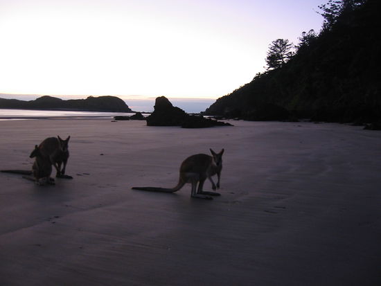 Nachdem wir gegen spätem Nachmittag im Cape Hillsborough NP angekommen waren und unser Camp errichtet hatten, ging es erstmal in die Waschküche. Tascha brauchte dabei Begleitschutz, da der Weg von 4 Wallabies (kleinere Art von Känguruhs) versperrt wurde, die anscheinend keinerlei Scheu besaßen und sich sogar streicheln ließen!