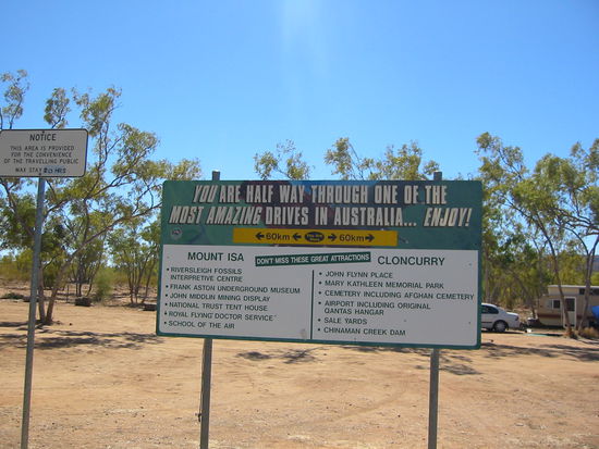 Da der Inlandweg von Cairns ins Outback etwas zu holprig sein soll, entschieden wir uns wieder zurück nach Townsville zu fahren und von dort aus über den Flinders-/ und Overlanderhighway ins Landesinnere vorzustoßen. Um die Kosten etwas einzugrenzen, entschlossen wir uns die nächsten Nächte mal versuchsweise auf Rastplätzen oder Roadhouses zu verbringen. Dort kann man kostenlos nächtigen und geduscht wird an der nächsten Tanke für 2 Dollar. Zähneputzen und Pippi-Machen unter Sternenhimmel hat auch was- vielleicht nicht gerad romantisches, aber halt irgendwas .
