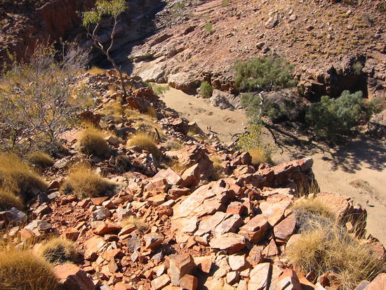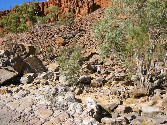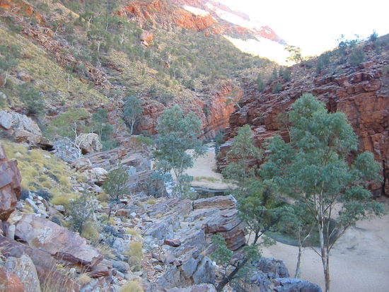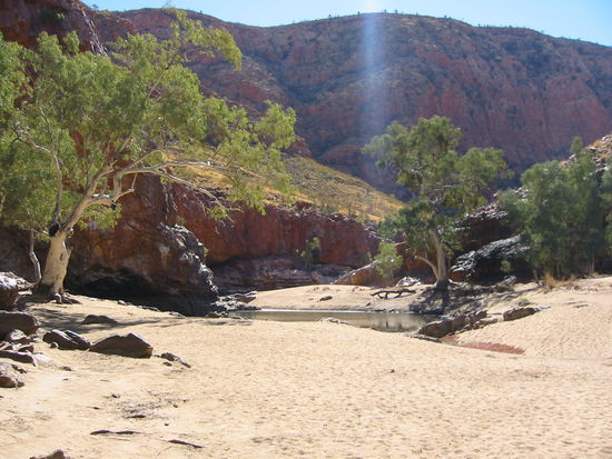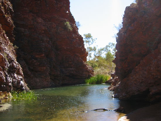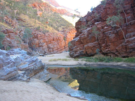 Am nächsten Morgen erwachten wir inmitten einer eindrucksvollen zerklüfteten Landschaft, die wir im Dunkeln absolut nicht erahnt hatten. 50 km weiter machten wir erst mal einen ausgedehnten Morgenspaziergang am Ellery Creek Waterhole, einem kleinen, aber verdammt tiefen und deshalb auch extrem eiskalten Wasserloch. Wäre es etwas wärmer als die lausigen 14 Grad Lufttemperatur gewesen, wäre ich natürlich auch einmal reingesprungen*lol*...!