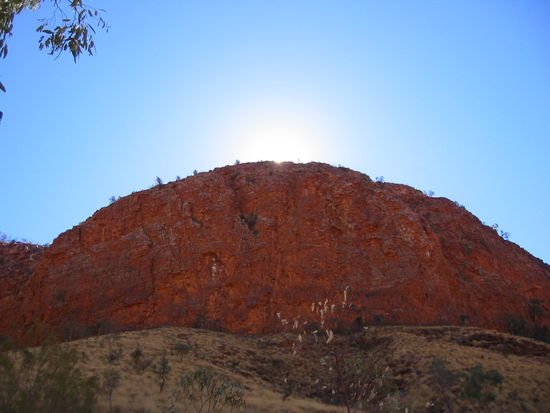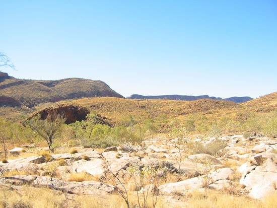 Nachdem wir den Tag damit verbracht haben, zurück nach Alice Springs zu fahren und uns bei "Meckes" (wird hier sogar offiziell so genannt!) erst mal was Leckeres gönnten, stellten wir fest, dass es doch schon sehr spät zum Weiterfahren war. Zudem realisierten wir, dass die Mac Donnell Ranges zwar 20 Fahrminuten von Alice Springs beginnen, es aber ca. 150 km bis zum Campground sind. Entgegen den Ratschlägen von Australiern und Reiselektüren, nicht in der Dunkelheit oder bei Tagesanbruch zu fahren, entschlossen wir uns aber zumindest bis zum nächsten Rastplatz ausnahmsweise mal eine kleine Dummheit zu begehen. So fuhren wir zuerst mit 50 km/h über die Landstraße und bei Sichtung der ersten Kängurus nur noch mit 30 km/h, da wir erstens keinen "Känguru-Fänger" vor dem Jeep haben (mit so einer Art überdimensionalen Stossstange sind hier viele Autos und vor allem die Roadtrains ausgestattet) und zweitens natürlich keiner Fliege was zu Leide tun wollen. Naja, mal ausgenommen von den lästigen Fliegen, die einem hier ständig in Mund, Nase, Augen oder Ohren fliegen wollen! Das Interessante an dieser Nachtfahrt war aber, zu sehen, wie aus einer tagsüber ausgestorben wirkenden Einöde bei Anbruch der Dunkelheit das Leben hopst. Zu dumm nur, dass diesen Tieren entweder der Orientierungssinn oder der Überlebensinstinkt fehlt, da sie einem selbst bei extrem langsamer Fahrt vors Auto hüpfen und das Ganze noch viel unkontrollierter wird, wenn man Lichtsignal gibt oder anfängt zu Hupen! Nach 90km und ca. 2,5 Stunden (!) später konnten wir uns endlich in unser Penthouse verkriechen und uns von der echt anstrengenden Fahrt erholen- NIE wieder Nachtfahrt im Outback!!!