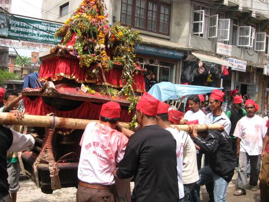 Eine weitere Besonderheit befindet sich am Kathmandu Durbar Square, naemlich der Kumari Bahal. In diesem Haus lebt die Kumari, die einzige lebende Goettin der Hinduisten. Es handelt sich um ein junges Maedchen, das typischerweise mit 4 oder 5 Jahren aus der Shakya-Kaste (Newari-Gemeinde) ausgewaehlt und dann bis zur Menstruation als lebende Goettin verehrt wird. Auch vom Koenig wird (wurde) sie einmal im Jahr besucht und erteilt(e) ihm dabei den Segen. Nur einmal im Jahr gibt es ein Fest, bei dem Fotos von der Kumari gemacht werden duerfen, in der restlichen Zeit ist es verboten. Fuer naeher Interessierte gibt es hier eine nette Erzaehlung zur Kumari.