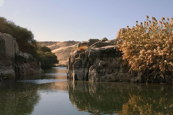 Der Nasser-Stausee birgt 260 Mrd. m³ Wasser und ist 500 km lang - 300 in Ägypten und 200 im Sudan. Der Damm ist 120 m hoch, 3,5 km lang, unten ist er 900 m dick und oben noch 40 m. Hier gewinnt Ägypten mit 12 Turbinen 60 % des Strombedarfs.
