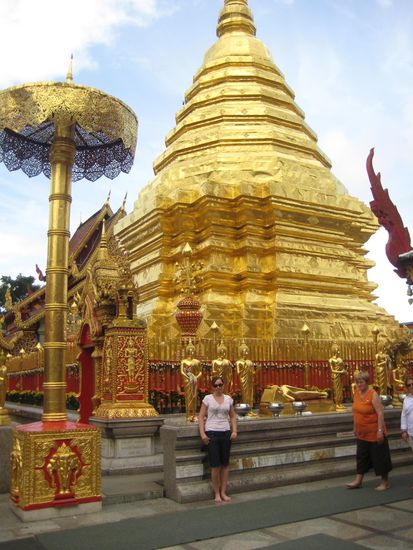 Dann noch ein stueck mit dem Bamboo auf dem Fluss und schon war der schoene Tag wieder vorbei. Donnerstag haben wir dann nen Roller gemietet und haben uns den Zoo von Chiang Mai angeschaut, der es allerdings nicht wert ist. Und danach sind wir in den Wat Doi Suthep, ein Kloster auf dem Berg bei Chiang Mai, sehr beeindruckend.