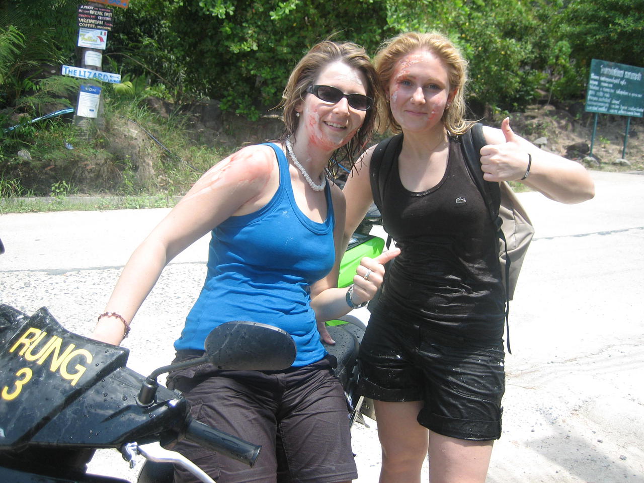 Aber Melanie hatte eine super Idee: Sie faehrt mit dem gesamten Gepaeck weiter, direkt zum Bungalow! Diana und Ela mieten die Roller und kommen nach, so machten wir es auch, einfacher gesagt als getan. Ueberall Strassensperren, von feiernden Thailaender, um die vorbeifahrenden Leute mit Wasser zu begiessen und anschliessend das Gesicht und Arme mit Puder zu beschmieren. Bei einigen bekamm man auch rote Farbe ab, dabei gratulierten Sie zum neuen Jahr!