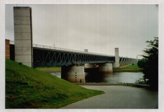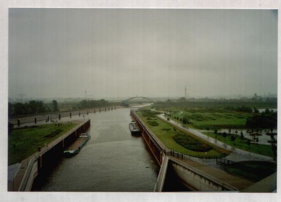 Vergangenheit.Das Herzstück ist die längste Kanalbrücke der Welt mit 918 m in der der Mittelandkanal über die Elbe geführt wird.Bereits 1934 wurde mit dem Bau begonnen jedoch nicht fertiggestellt.Die Kanalbrücke ist auch für Besucher zugänglich. Bisher mußten die Schiffe über den Mittellandkanal kommend zunächst über das Schiffshebewerk Rothensee zur Elbe "absteigen" das 1938 in Dienst gestellt wurde.