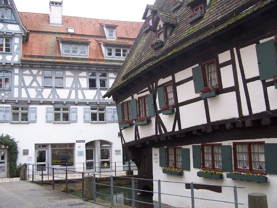 Die Häuser der Gerber liegen ebenfalls an der Blau. Darin wurden die gegerbten Fälle gewaschen und dann an den Häusern aufgehängt.