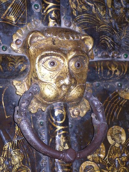 Aber besonders schön war die Goldene Tür des Portals. Sie besteht aus Goldguss und die Darstellungen sind feuervergoldet. Sie ist sehr gut erhalten und kaum restauriert. Die einzelnen Tafeln erzählen die Leidensgeschichte Christi. Große Löwenköpfe, als Türgriffe, übernehmen im Bildprogramm die Rolle der Wächter.