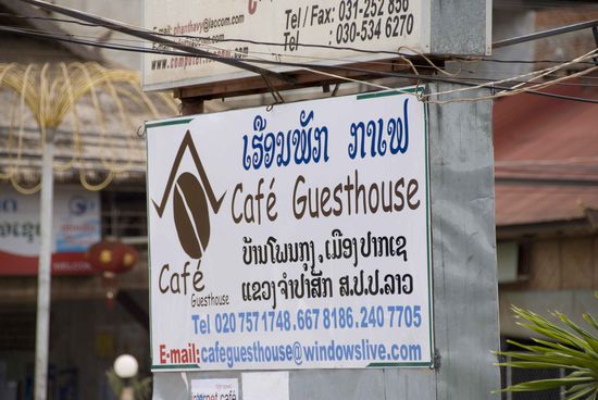 In Pakse angekommen gingen wir vom Busbahnhof Richtung Zentrum. Nachdem wir den chinesischen Premierminister freundlich gegrüßt haben, der mit viel Blaulicht und Eskorte durch die Hauptstraße (Route 13) gehuscht ist, kamen wir nach etwa 500 Metern von der Busstation entfernt an einigen Chinarestaurants vorbei. Dort entdeckten wir auch ein Schild vom Cafeguesthouse. Wir wollten eh nur eine Nacht in Pakse bleiben und am nächsten Tag mit dem Bus weiter, somit schaute sich Mirko das Zimmer an und wir checkten ein.
