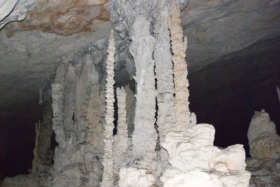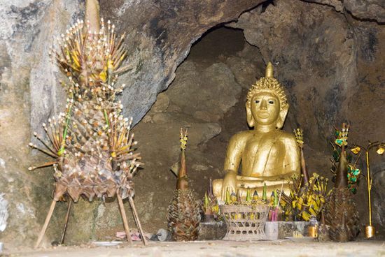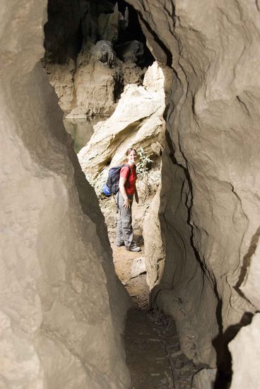 Tags darauf waren wir die ersten Besucher der Tham Lot Kong Lo, der sieben Kilometer langen Höhle, durch die wir mit einem Boot, zwei Bootsführern und drei Taschenlampen in etwa 45 Minuten durchfuhren. Während der Durchquerung der Höhle musste man auch ab und an aussteigen (Niedrigwasser, da momentan noch Trockenzeit), um das Boot über Sandbänke zu ziehen. Einmal am anderen Ende angekommen, fährt man nach einer kurzen Pause den gleichen Weg wieder zurück!