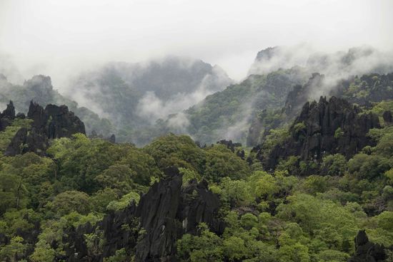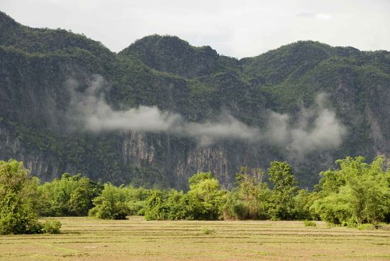 Ein Tag später. Wegen Regen sind wir erst gegen Mittag von Lak Sao gestartet, war aber kein Problem, die Straße (Road 8) zu unserem Ziel war gut zu befahren und landschaftlich reizvoll ging es durch den Dschungel und an Karstfelsen vorbei.