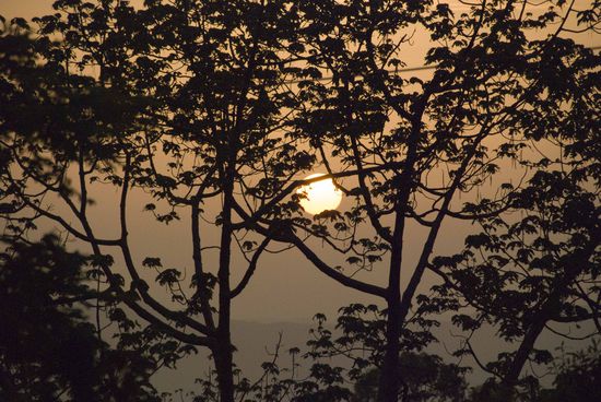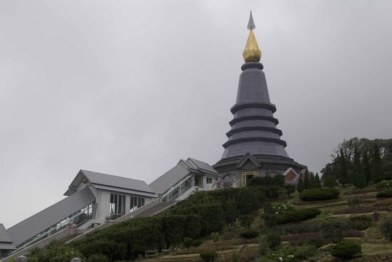 Ab etwa 1800 Meter Höhe beginnt der feuchte immergrüne Nebelwald, der die meiste Zeit des Jahres in Nebel gehüllt ist. Ein paar Kilometer vor dem Gipfel standen noch zwei Chedis (Chedi = Teil einer buddhistischen Tempelanlage).