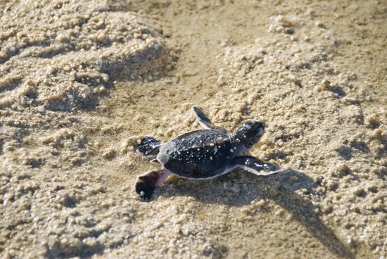 … in diesen geschützten Bereich gebracht. Je nachdem, wo die Ranger die Eier vergraben, bestimmen sie das Geschlecht mit. Sonnenplatz (32°) ergibt eher Weibchen, Schattenplatz (28°) eher Männchen.