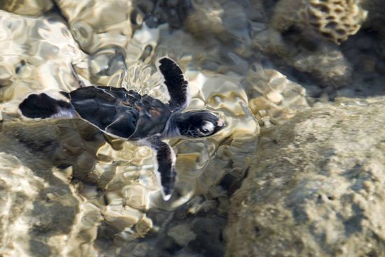 Da die Schildkröten meistens erst ab 20.00 Uhr an Land kommen (wahrscheinlich wollen sie erst noch die Tagesschau sehen), hatten wir noch den ganzen Nachmittag zur freien Verfügung. Die Insel ist wirklich nicht sehr groß, wir legten uns an den schönen Strand und liefen am Korallenriff entlang (Vorsicht, zerbrechlich!). Es war so gemütlich hier, irgendwie kam es uns so vor, als hätten wir Urlaub. Dann war helle Aufregung angesagt. Kinder entdeckten frisch geschlüpfte Schildkröten, die sich Richtung Meer aufmachten. Wirklich beeindruckend, wie sich die Kleinen durch den Sand schaufeln, dann bei Ebbe über das Riff müssen um in das Meer zu gelangen. Und kein schöner Gedanke, dass nur drei Prozent ihre Jugend überleben, da sie als Futter sehr beliebt bei Vögeln und großen Fischen sind. Wenn das alles überwunden ist, dann kommt der Mensch mit dem Suppentopf ... Hier auf Turtle Island möchte man alles tun um diese Art zu schützen. Ranger kontrollieren jede Nacht die Strände, registrieren die Schildkröten, prüfen den Gesundheitszustand und sammeln alle gelegten Eier ein um sie in einem geschützten Bereich wieder zu vergraben. Außerdem schlüpfen jeden Tag junge Schildkröten, diese werden aus einem Behälter ins Meer entlassen, so sind sie zumindest keine leichte Beute für Vögel mehr. Solch einen Ablauf (Eier einsammeln, vergraben und Junge ins Meer bringen) konnten wir uns ansehen, allerdings auch nicht ewig lange, denn wenn die Schildkröten gestört werden, gehen sie ohne Eiablage wieder zurück ins Meer.