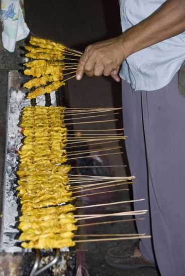 Und noch eins können wir: essen. Falls wieder Gerüchte aufkommen sollten, dass wir zu dünn seien, na ja, die Satey-Spieße sind halt schon sehr lecker. Und es waren ja nur 30 Stück heute Abend, d.h. gerade mal 15 für jeden. Ok, noch ein wenig Erdnußsoße dazu. Ach, was soll's. Eins ist sicher, falls wir wieder mal nach Hause kommen sollten, möchten wir auch so einen Grill für Satey-Spieße.