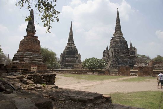Nach dem Markt besuchten wir den Wihan Phramongkhon Bophit mit einem großen sitzenden bronzenen Buddha. Wie es sich in jedem Haus in Thailand gehört, heißt es erstmal Schuhe ausziehen und dann eintreten. Danach gingen wir zur Tempelanlage Wat Phra Si Sanphet. Mal unter uns, nach diesem Tempelbesuch waren wir durch Hitze und Zeitumstellung doch ein wenig platt, so lockte die Klimaanlage in unserem Zimmer und der Grand-Palace-Besuch wurde erst mal gestrichen. Zudem mussten wir ja noch mit dem Flughafen wegen Mirkos Gepäck telefonieren. Dies wurde dann auch gegen 19:30 Uhr geliefert und Tante Heidis Pendel hatte wohl doch Recht behalten, dass alles gut gehen wird.