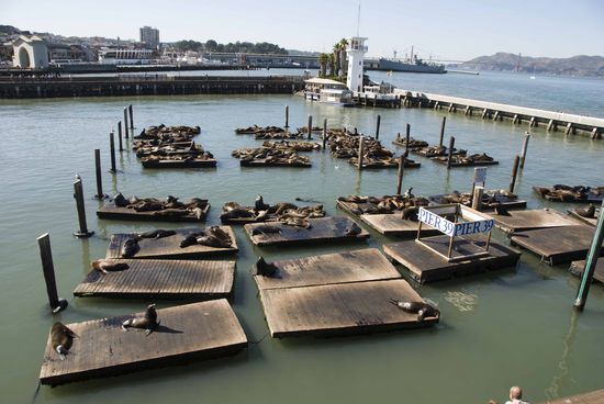 Im Viertel „Fisherman’s Wharf“. An der Pier 39 haben Seelöwen die Bootsanlegestellen in Beschlag genommen.