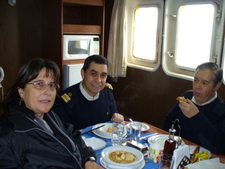 Der Kapitän ist schon mit Juan am Essen und meint: "Adelante, nur herein, es hat noch Platz". Und jetzt ist es wieder einmal an mir, zu staunen. Das Essen ist ausgezeichnet. Und während die Passagiere Selbstbedienung haben, wird hier von einem Kellner serviert. Es gibt Empanades mit Käsefüllung zur Vorspeise, eine fantastische Fischsuppe und zum Hauptgang, den ich allerdings auslasse, Schnitzel mit Salat oder einer Beilage nach Wahl. Und als Dessert fein zugeschnittene Kiwis und Äpfel oder Pepino-Kompott. Eine süsse Frucht, die in Chile wächst.