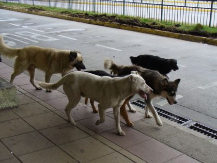 Ich gehe zum Busterminal, will meine nächste Fahrt abklären. Und da mache ich eine lustige, aber auch traurige Beobachtung. Ein Rudel Hunde wartet an der Strasse bis die Fahrbahn frei ist. Dann überqueren alle miteinander gesittet die Strasse. Ich bleibe ihnen auf den Fersen. Sie bleiben zusammen, alle tragen Kampfspuren, sind auf sich selber angewiesen. Wie sich ein anderer Hund nähert, wird er vertrieben. Die Gruppe schnüffelt an allen Ecken, sucht etwas zu fressen.