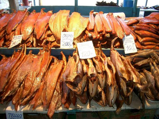 In Petropavlovsk war an diesem Tag der so genannte Tag der Marine. Das heißt die ganze Stadt war auf den Beinen um zu feiern. Zunächst haben die Reisenden im Hotel eingecheckt und sind dann zum Markt gefahren, den sie sich ein wenig angeschaut haben. Es gab eine Fülle von äußerst leckeren Fischangeboten die aus der unmittelbaren Nähe von Petropavlovsk aus dem Ochotsken Meer und den Pazifischen Ozean gefischt werden. Und natürlich auch in großen Mengen Lachs, der jetzt ja die Flüsse hinaufwandert. Lachsrogen oder roter Kaviar wurde dort zum Beispiel in einer Menge von etwa einem Kilo für 280 Rubel zu bekommen. Das sind ungefähr umgerechnet 10 Euro.