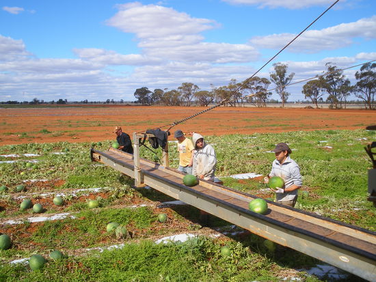 Wie geht es jetzt also weiter? Melonharvest dauert noch ein paar Tage und bis auf prunning, auf deutsch "Baeume zurueck stutzen und Geiltriebe abschneiden" gibt es keine andere Arbeit. Mir bleibt also nicht anderes ueberig als dies von allen so verhasste Arbeit zu absolvieren. Und dann auch noch auf Piecerate, also Bezahlung nach Leistung. Dieser Tag ist mein absoluter Horrortag und ich kann jetzt im nachhinein noch die schmerzen spueren. 99Dollar mache ich an diesem Tag und ich reisse mir den Ars... auf. Und die verdiene ich auch nur, weil ich morgens noch 1,5 Stunden auf Stundenbasis arbeiten kann und danach die besser bezahlen Reihen bekomme. Man geht von Baum zu Baum, bueckt sich immer wieder, nimmt den Plastikschutzt vom Stamm, schneidet die ganzen Geiltriebe ab, Plastikschutzt wieder drauf und geht zum naechsten Baum. ca. 500 Baume hab ich an diesem Tag gemacht. Meinem einzigen Prunningtag!!! Am Ende des Tage geh ich zu Andre, sag entweder ich kann ab morgen fuer dich arbeiten oder ich verlasse die Farm. Es gab keinen Muskel der nicht geschmerzt hat. In der Mitte des Tages treffe ich Paula und das wir uns nicht heulend in die Arme fallen und uns gegenseitig bemitleiden ist das einzige was nicht passiert. Auch sie macht diese Arbeit nur noch einen weiteren Tag bevor sie Vollzeit im Pub anfaengt. Und ich als Andre's Azubi