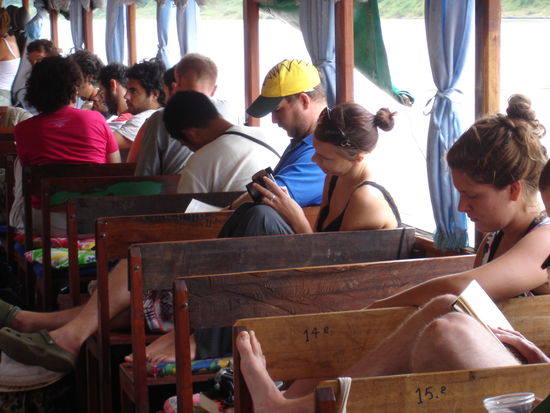 Endlich geht es dann ab aufs Boot und wir haben Glueck. Jeder hat eine ganze Bank fuer sich. Und anfangs ist das Boot auch verhaeltnissmaessig leer. Das aendert sich dann aber kurz vor der Abfahrt. Und hier zeigt sich dann, dass eine Reisegruppe nicht immer von Vorteil ist. Da wir vor den anderen die Grenze verlassen haben waren wir entsprechend frueh auf dem Boot und konnten unsere Plaetze sichern. Die anderen muessen sich dann aber jetzt (wie auch eigentlich vorgesehen) zu zweit auf die Holzbank setzen. Und wir haben Glueck. Bevor wir unsere Baenke teilen muessen sind die letzten Backpacker eingetroffen. Luxus!!!
