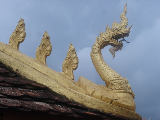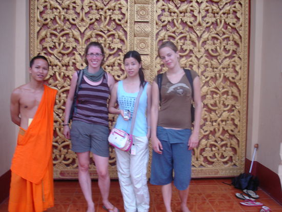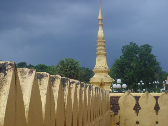 Am naechsten morgen mach ich mich also nach dem Fruehstueck erstmal auf ins Internetcafe. Neben emails cecken und Reisebericht schreiben versuche ich mich dann mal am Flug buchen auf Englisch. Und es klappt hervorragend. Nach 20 Minuten hab ich alle Daten und bin jetzt stolze Besitzerin einer Flugtickets von Kuala Lumpur nach Yogjakarta am 11. Juli. Und das ganze fuer 50 Euro. Perfekt. Danach treff ich mich mit Claudia zum Busticket buchen und auschecken. Und ich telefonier mit Elsa. Die ist seit ein paar Tagen in Vientienne und schliesslich treffen wir uns mit ihr. Zu dritt ziehen wir also los und besuchen die beiden wichtigsten Attraktionen von Vientienne,. Zurerst geht es zum Triumphbogen in klein, wo wir auch hoch laufen eine ganz nete Aussicht ueber die Stadt haben und dann weiter zu einem goldenen Tempel. Und hier heisst es dann mit der Kamera austoben. Der Himmel ist schwarz, vereinzelt haben wir noch ein paar Sonnenstrahlen und dann dazu der goldene Tempel. Wir koennen gar nicht genug Fotos machen. Letztendlich kann uns nur der einsetztende Regen stoppen. Aber auch der hat sein gutes. Wir fluechten in einen angrenzenden Tempel wo uns ein paar junge Moenche anbieten uns alles anszuschauen. Normalerweise ist dieser geschlossen. So kommt es das wir eine Privatfuehrung bekommen und darueber hinaus noch so einiges ueber den Buddhismus lernen. Und last but not least fragt mich der Monk am Ende (nachdem wir einige Fotos gemacht haben) ob ich ihm die Fotos schicken koennte. Klar, sag ich, aber wie?? Per email, natuerlich. Ja so hab ich jetzt also die email adresse von einem Monk