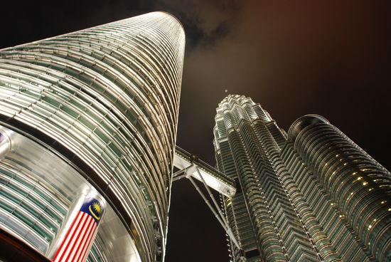 Am naechsten morgen haben wir uns mit Chris an der Rezeption verabredet, da wir gemeinsam zu den Twin Towern moechten. Allerdings verschlafen wir total, so dass wir keinen Chris sehen und alleine losfahren. Ein wenig entmutigt kommen wir schliesslich bei den Twin Towern an, da uns jeder gesagt hat, man muesse frueh da sein, wenn man Karten moechte. Aber wir haben Glueck. Die Schlange ist zwar lang, aber es sieht so aus als wenn wir noch dran kommen. Und wie es der Zufall will steht auf einmal Chris neben uns. Endlich sind wir dann an der Reihe und bekommen ein Ticket fuer 14:30. Das ist super, da wir dann vorher noch was Zeit haben die Stadt zu erkunden. Gemeinsam fahren wir mit der Bahn ans andere Ende der Stadt, aber schnell stellt sich raus, dass es Melanie doch noch nicht so gut geht. Sie beschlisst schliesslich sich im Hostel nochmal hinzulegen und sich dann spaeter mit uns bei den Towern zu treffen. Alleine geht es also mit Chris weiter und wir haben einen wahnsinnigen Spass. Wir schaffen es sogar in die groesste Moschee von KL zu kommen, wo normalerweise nie ein Tourist oder Nicht-Muslime Zutritt bekommen wuerde. Und die sind dermassen nett zu uns und erklaeren alles. Es ist nicht zu fassen. Danach gehen wir noch in einige Parks und fahren dann zu den Towern zurueck. Gemeinsam mit Melanie fahren wir schliesslichhoch auf den Tower, wo man von der Verbindungsbruecke eine super schoene Sicht auf die Stadt hat.