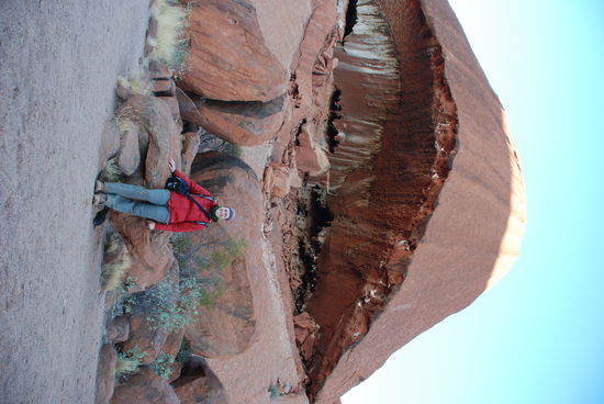 Irgendwann bekommen wir dann ein schlechtes Gewissen den anderen gegenueber und versuchen sie wieder einzuholen. Aber es scheint aussichtslos, da wir vorallem auch nicht wissen wo wir uns denn jetzt treffen. Irgendwann kommen wir an den Punkt, dass wir eh schon so spaet dran sind, dass jetzt auch das ganze gelaufe nichts mehr bringt und wir stattdessen Uluru von allen moeglichen Seiten mehr geniessen. Irgendwann stossen wir dann auch wieder zu den anderen und uner Guide erklaert uns die Geschichte um Uluru und einige Hoehlenmalereien. Hier wird es dann allerdings recht kalt. Waehrend unserer ganzen Fotografiererei und der vielen Bewegung haben wir gar nicht gemerkt wie kalt es noch ist, aber hier ueberhitzt stehen und nur zuhoeren, da kriecht einem doch recht schnell die Kaelte ueberall hin. So sind wir dann alle ziemlich froh als wir mit dem Bus weiter zum Uluru Museum fahren, dort die Geschichte weiter erforschen und dann zum Camp zurueck fahren.