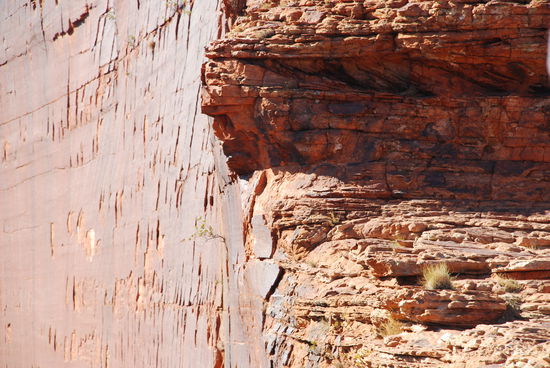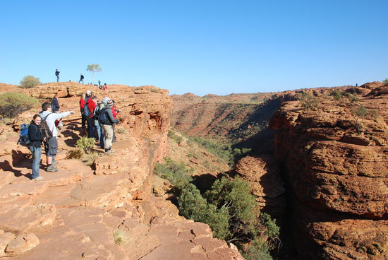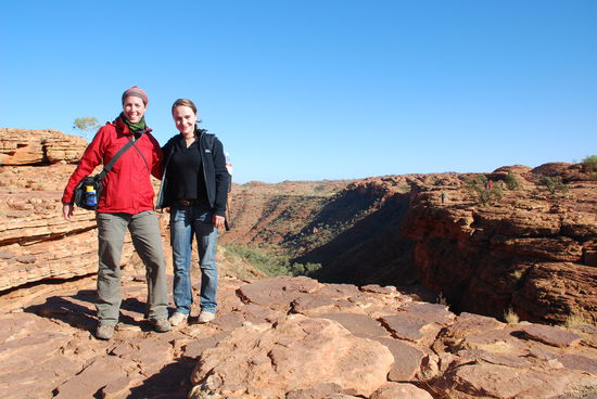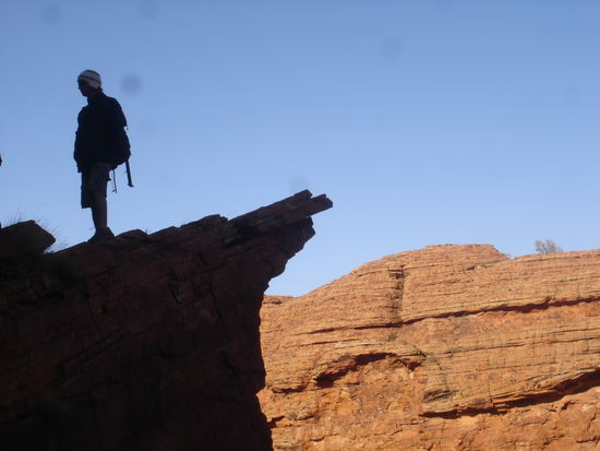 Zum ersten mal in meinem Leben bin ich froh aufstehen zu koennen. Die Nacht war zwar wieder einmalig schoen im Bezug auf den Sternenhimmel und das Abendteuer im australischen Outback draussen zu schlafen, aber es war einfach nur abartig kalt. Normalerweise habe ich einen sehr unruhigen Schlaf, drehe mich Tausend mal um und liege nur sehr selten einfach ruhig da. Diese Nacht habe ich mich kein einziges mal aus meiner Embryonalstellung raus bewegt, den Schlafsack und die Decken weit ueber den Kopf gezogen, angezogen wie ein Michelinmaennchen. Alles was ich dabei habe trage ich in dieser Nacht und trotzdem friere ich wie Sau. Aber irgendwie hat auch das etwas. So huepfen wir also ein weiteres mal mitten in der Nacht aus den Federn, fruehstuecken schnell und fahren dann zum Kings Canyon um bei Sonnenaufgang mit unserer vierstuendigen Wanderung zu beginnen. Diese Betonung auf vier Stunden und der mehrmalige Hinweis unter allen Umstaenden mind. 2 Liter Wasser bei sich zu haben macht mich Anfangs etwas nervoes. Auch wenn meine Fitness bei weitem besser ist als noch in Deutschland. Wir werden sehen. Aber wie immer wird mehr Wind um nichts bzw. wenig gemacht. Bis auf den anfaenglichen Aufstieg ist die Wanderung sehr passabel und machbar.