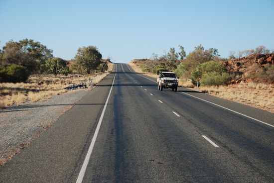 Immerhin haben wir nach der Wanderung, einem fruehen Lunch und Packen noch ein ganzes Stueck Fahrt zurueck nach Alice Springs vor uns. Dieses mal nutzen Craig und ich die Moeglichkeit vorne bei unserem Guide zu sitzen. Die Aussicht ist um Klassen besser und vorallem ist das was unser Guide so von seinem Leben und seinen Erfahrungen erzaehlt mehr als interessant.