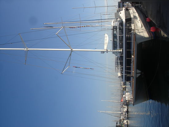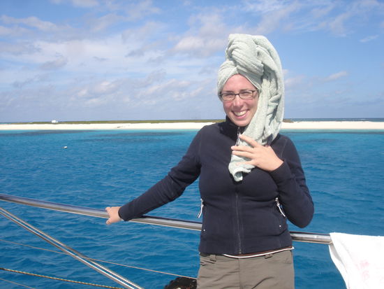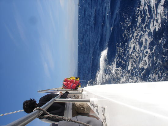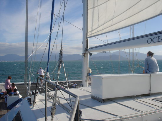 Zum ersten mal seit einigen Tagen geht es heute wieder frueh raus. Ich bin ganz schoen nervoes. So ganz kann ich mir das Great Barrier Reef ja nicht entgehen lassen und nachdem ich tagelang ueberlegt habe, ob ich denn nochmal Tauchen moechte bin ich zu dem Entschluss gekommen es mit einem Introduction Dive zu testen. Danach kann ich es immer noch sein lassen, aber einen Versuch gebe ich dem "Unterwasser-atmen" noch. Ich hab das Glueck upgegradet zu werden und die Tour auf einem schoeneren und besseren Boot machen zu koennen. Ganz schoen riesig der Cat mit dem wir unterwegs sind.
