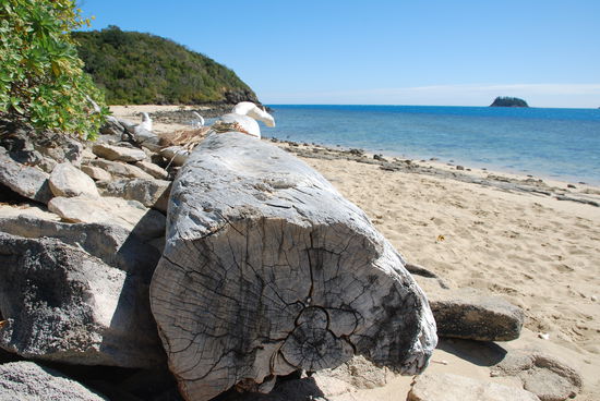 Am naechsten Morgen ist meine Aktion DAS Thema. Danke lieber Gott! Aber zum Glueck kann ich auch schon wieder drueber lachen. Frisch gestaerkt wollen wir zu einem weiteren Schnorchelplatz. Ich bin allerdings schon ziemlich skeptisch. Der Wind orgelt wie sonst was. Und der Wellengang ist auch nicht ohne, als wir aus der Landabdeckung kommen. An dem Schnorchelplatz angekommen merken wir, dass die Bucht zu ungeschuetzt ist und drehen wieder ab. Also auf zur Langford Island wo man bei Ebbe einen Inselspaziergang machen kann. Ansonsten ist das meiste ueberflutet.