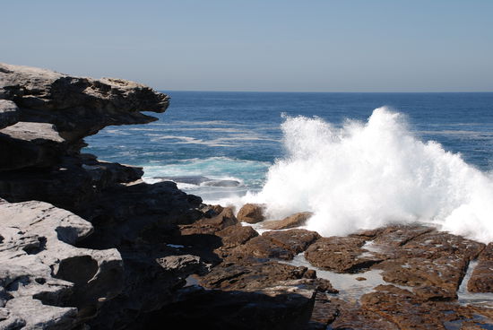 Am naechsten Tag ist Bondi Beach angesagt. Angeblich muss man ja da gewesen sein. Und uns gefaellt es. Vor allem die Wellen. Wir koennen gar nicht genug bekommen, quitschen bei jedem Wellenbrecher wie zwei kleine Schweinchen und machen 1001 Fotos. Hier eines davon.